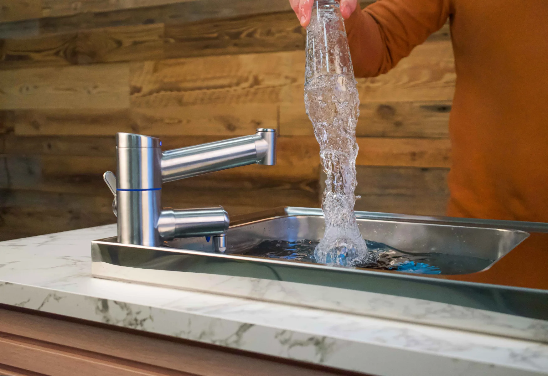 De AquaFox Slim is een slimme horecakraan die automatisch zorgt voor schoon spoelwater met de juiste dosering zeep. Onder de bar wordt een compacte AquaFox behuizing geplaatst. In deze behuizing zit een verwisselbare 2 liter zak zeep en de techniek die de dosering aanstuurt.