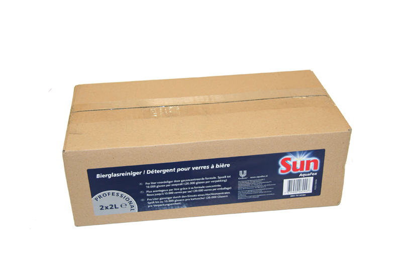 Doos van 2 x 2 liter Sun bierglasreiniger voor uw Aquafox systeem, 1 zak is voldoende om ongeveer 10.000 glazen te spoelen.